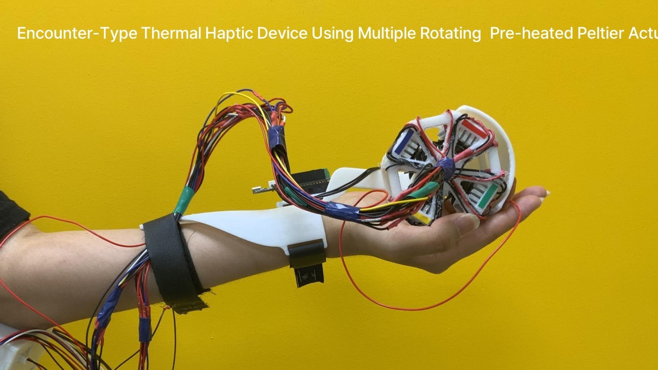 One of the main challenges in VR haptics is simulating the immediate sensation of touching materials with vastly different temperatures. Existing thermal displays often have a delay while heating or cooling, which disrupts realism. To solve this, we developed a wearable "encountered-type" haptic device that uses a rotating mechanism with four Peltier elements. By maintaining different initial temperatures on each element and rotating the correct one into contact with the palm, our device eliminates thermal delay. This system provides simultaneous thermal and force feedback, significantly enhancing user immersion in virtual environments.