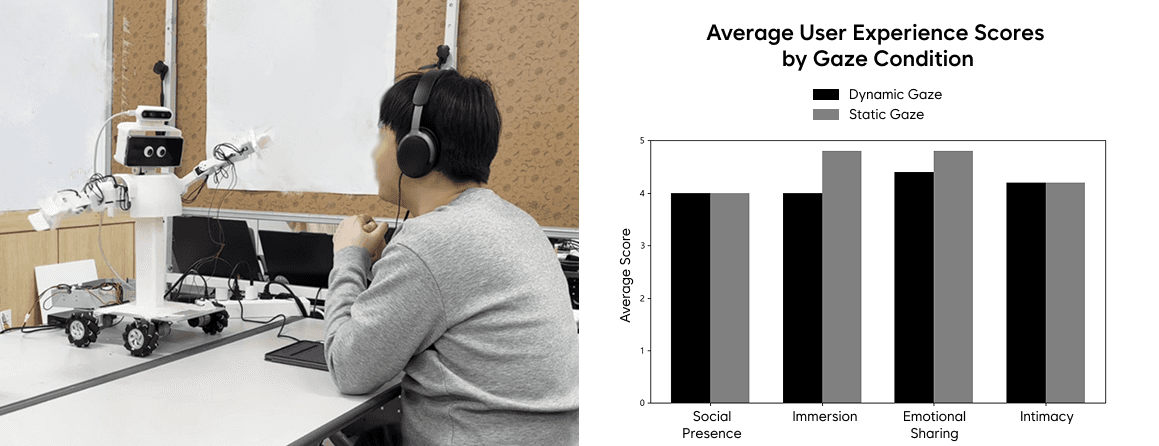 In contrast, immersion and emotional sharing scores were higher under the static gaze condition than under the dynamic, human-like gaze condition. This indicates that continuous gaze movement may introduce additional cognitive load in attention-demanding contexts such as counseling, or that slight delays and mechanical inconsistencies in dynamic gaze synchronization may negatively affect emotional engagement.