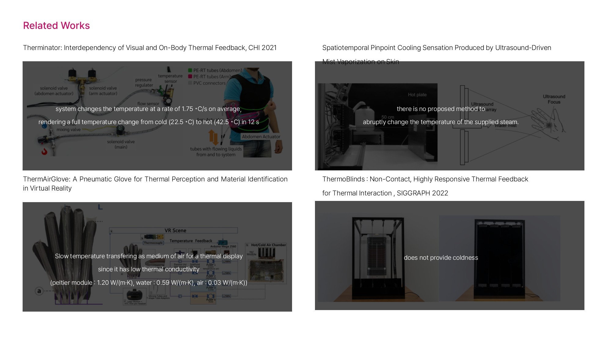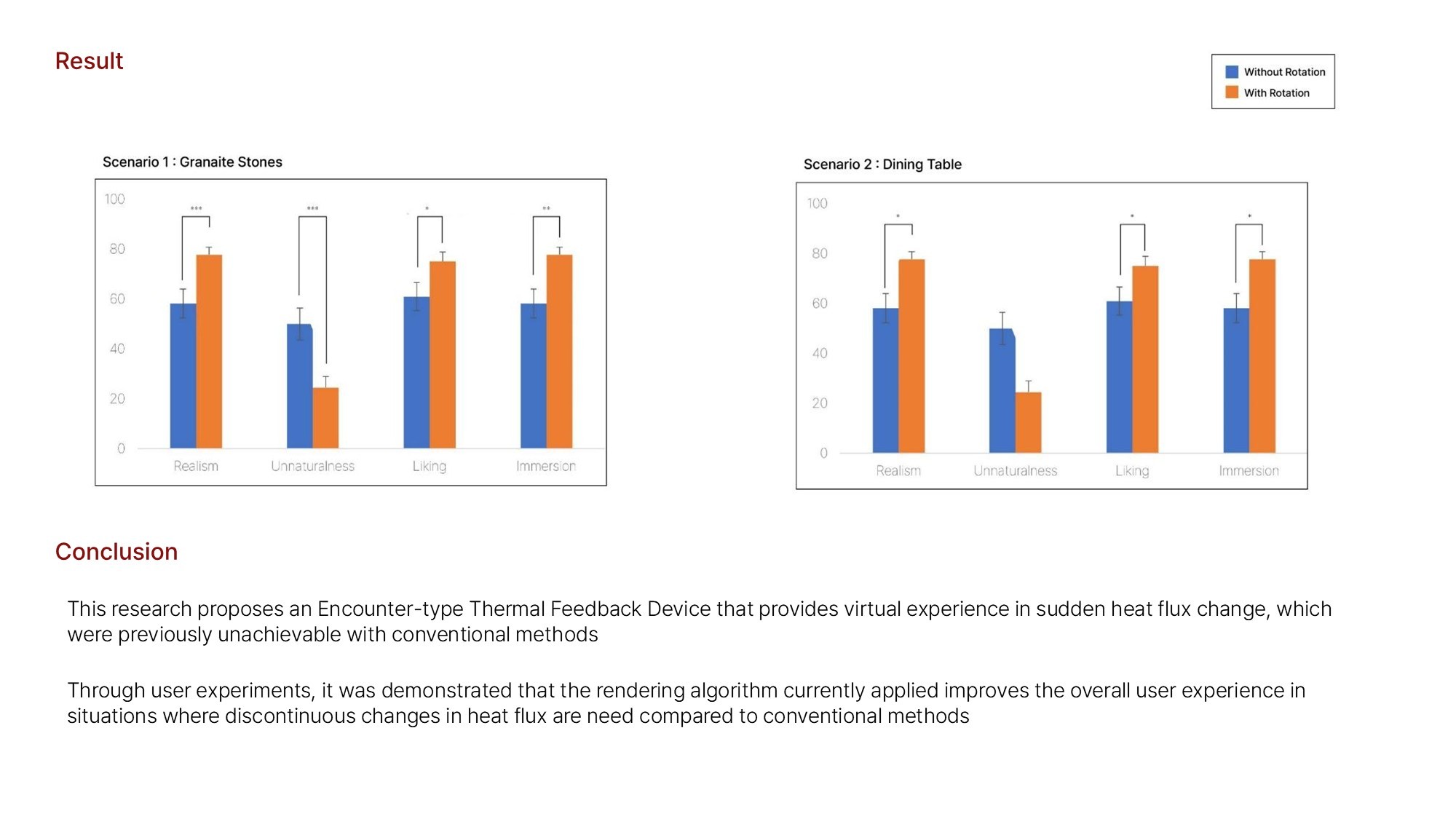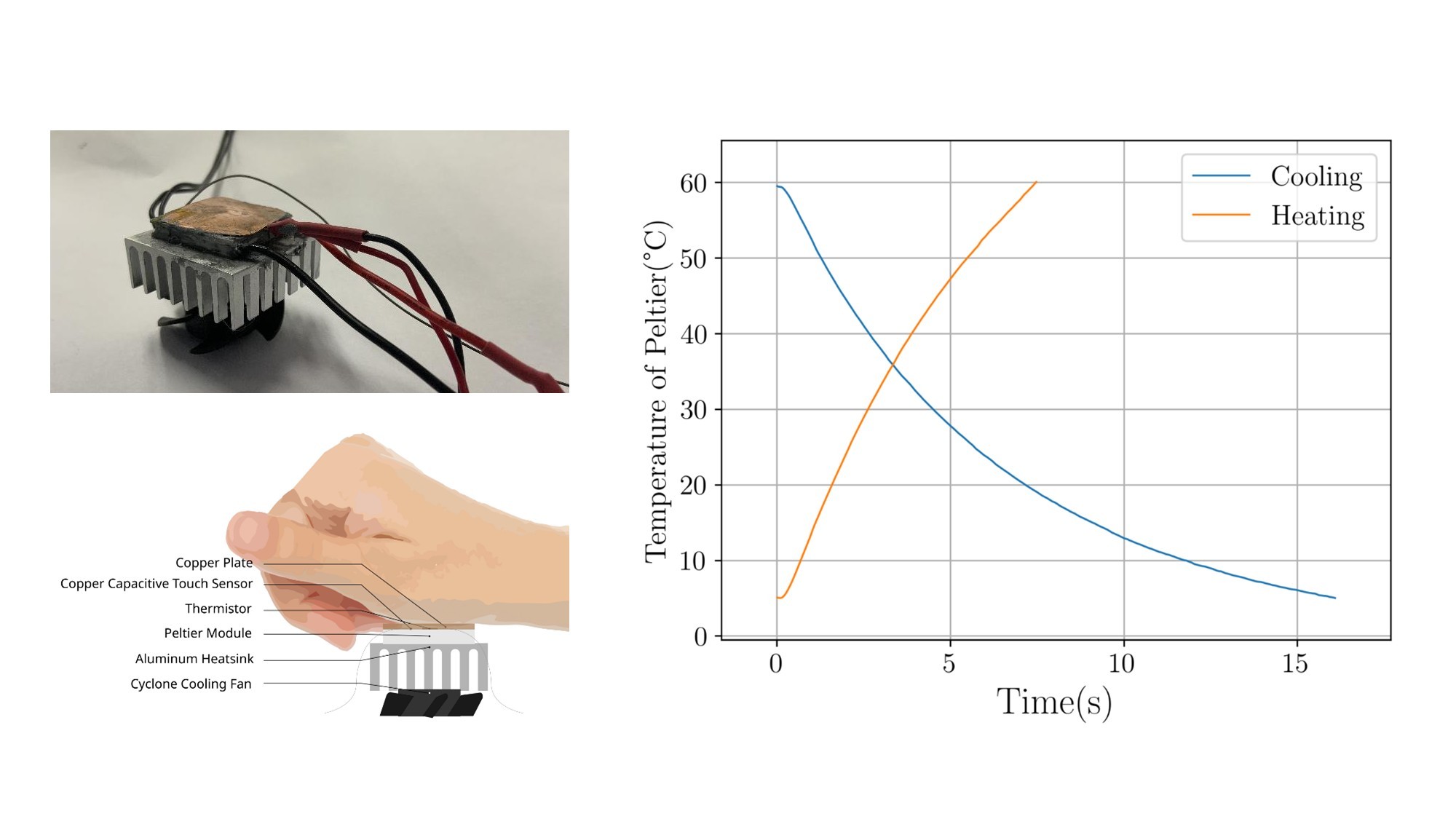 Hoseok Jung. 2023. Encounter-Type Thermal Haptic Device Using Multiple Rotating Pre-heated Peltier Actuators. Master's thesis. Pohang University of Science and Technology (POSTECH). (Advisor: Prof. Seungmoon Choi)