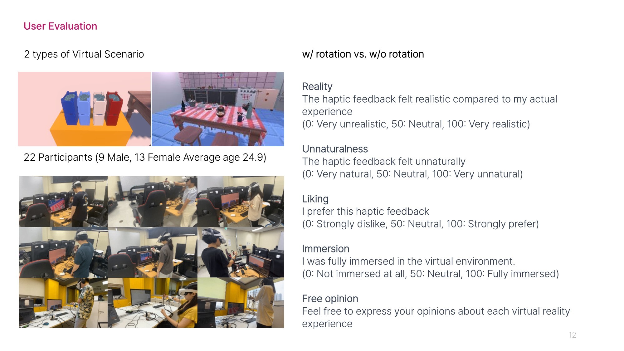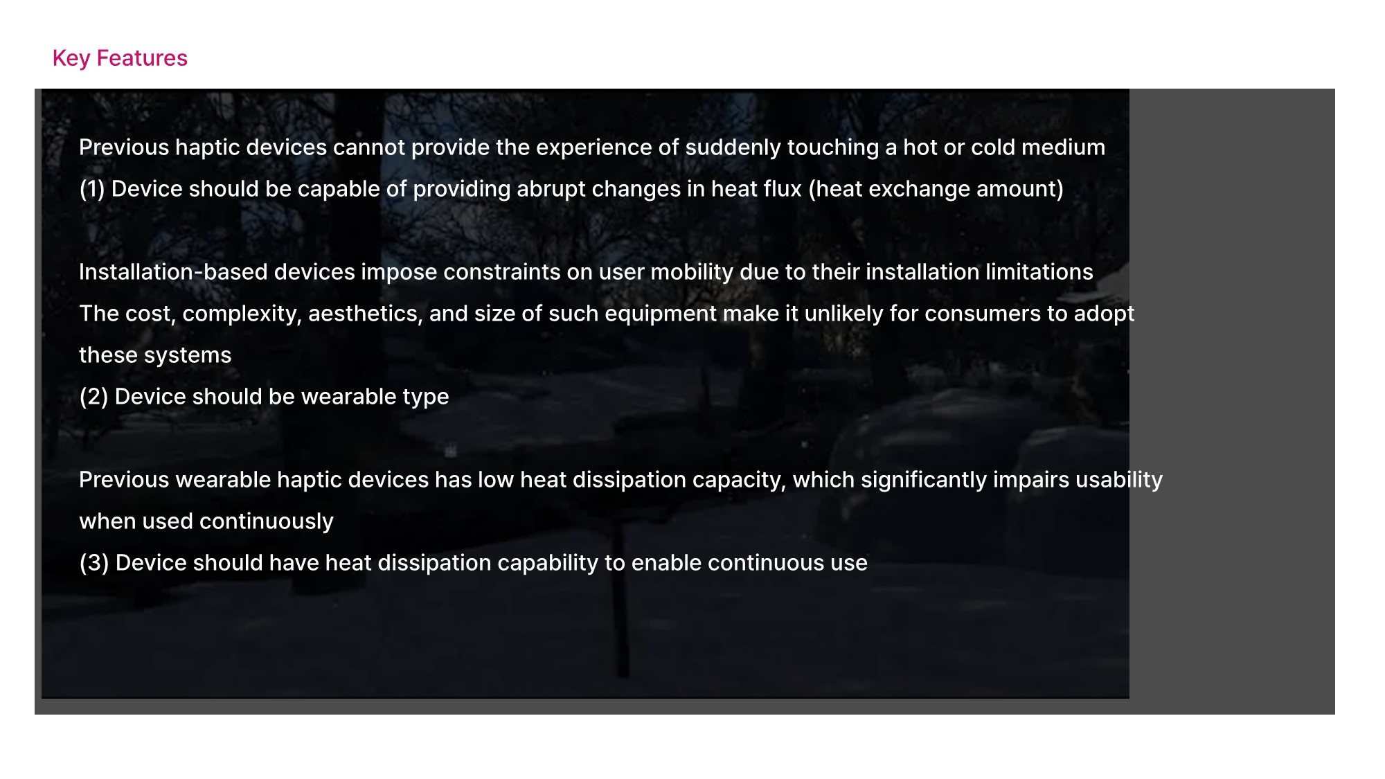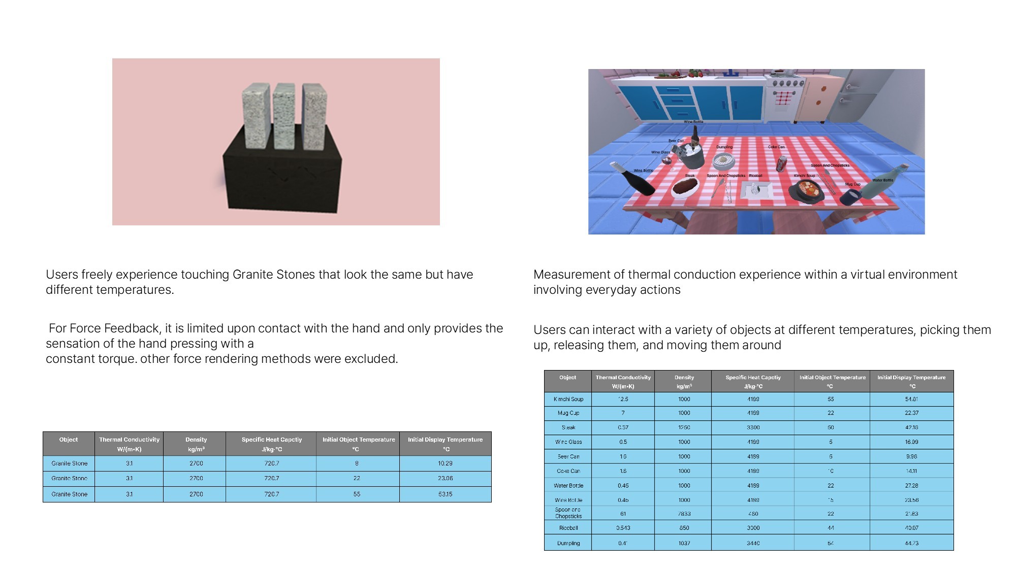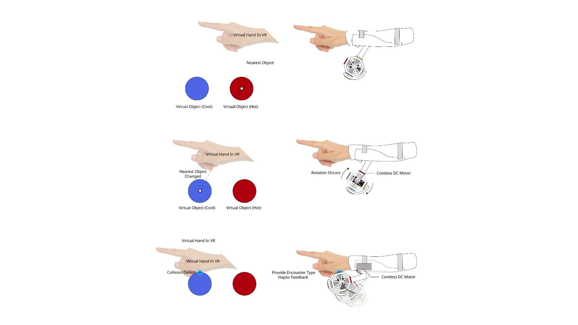 Hoseok Jung. 2023. Encounter-Type Thermal Haptic Device Using Multiple Rotating Pre-heated Peltier Actuators. Master's thesis. Pohang University of Science and Technology (POSTECH). (Advisor: Prof. Seungmoon Choi)